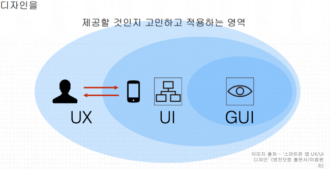 - UX/UI/GUI: 구체적인 사용자에게 어떠한 경험, 콘텐츠, 기능, 디자인을 제공할 것인지 고민하고 적용하는 영역