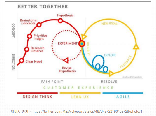 - 에자일 개발, 린UX, 디자인 씽킹 등은 디자인 프로세스의 하나로써 개발/디자인/기획 등에 필요한 구체적인 진행 단계 및 업무를 의미