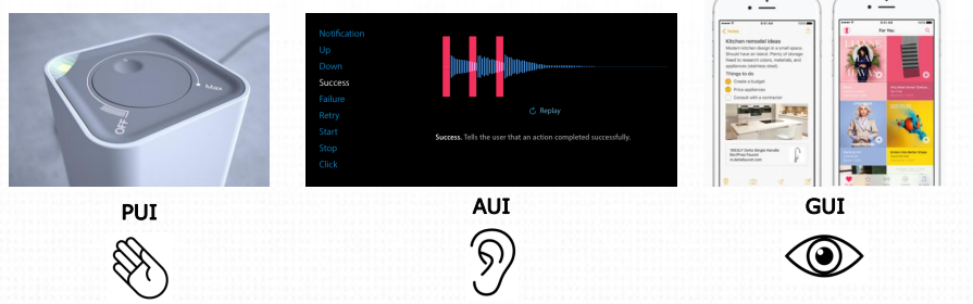 1. PUI (Product User Interface) : 제품의 외관에 있는 버튼, 스위치, 터치스크린,제품이 갖고있는 물리적 속성(볼륨버튼,전원버튼,홈버튼,메뉴버튼,백버튼)