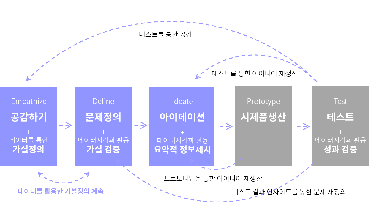 - 디자인 씽킹: 디자인 씽킹이란 인간을 관찰하고 공감하며 문제를 정의하고 프로토타입과 테스트의 실패 를 반복하여 최선의 답을 찾는 창의적 문제 해결 방법이다.