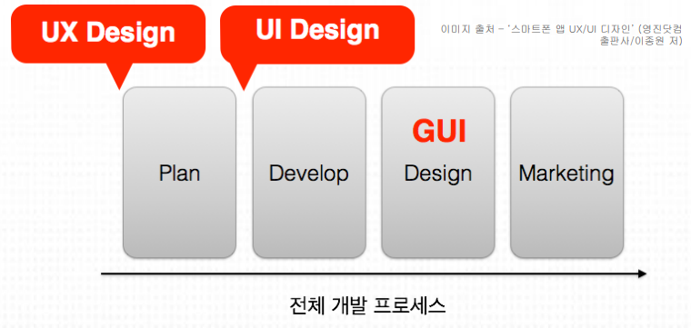 - 순서: 기획 > 개발 > GUI디자인 > 마케팅 (UX,UI를 특히 고려한다면 어느 위치에 들어가는지 고민해야 함)